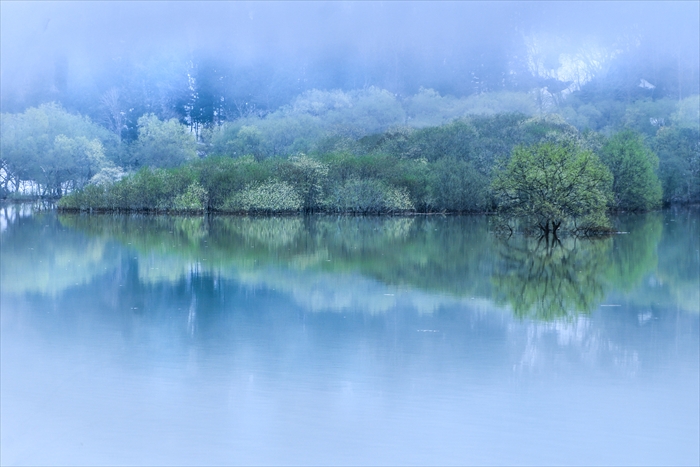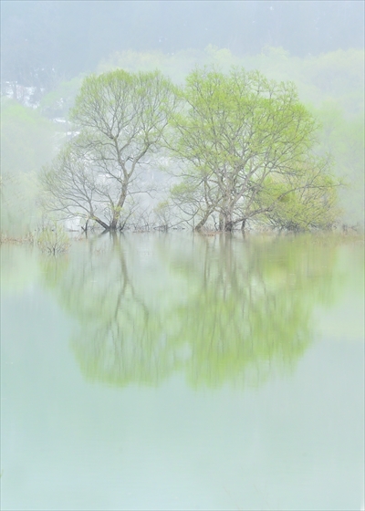 薄明るい朝の光、弱い霧に包まれた水没林は、透明感と涼やかさを感じさせた。