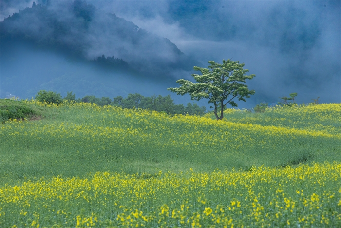 菜の花の丘が光を受けて金色に染まり、一本の木が静かにその朝を迎えていた。