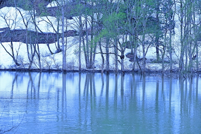 5月初めでしたが残雪もあり湖の水量も豊かで木々の新芽が綺麗に映り込んでいました。