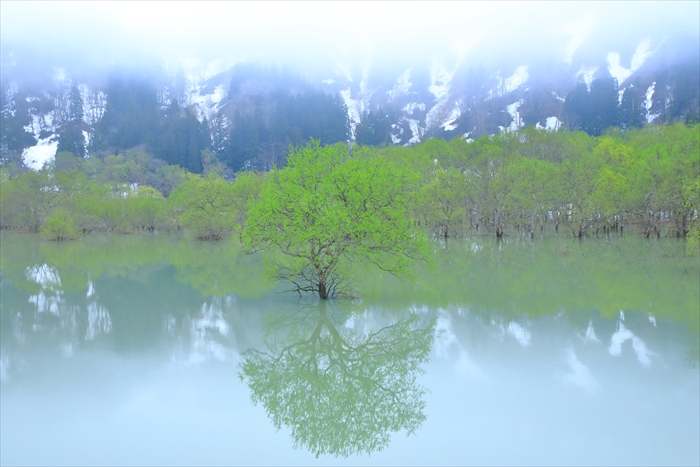 残雪が残る白川湖で水没林の芽吹きに心安らぐ春の息吹を感じた。