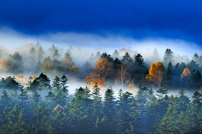 夕日を受けた霧が紅葉した木々の間を次々と流れていきました。
