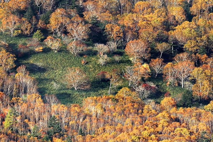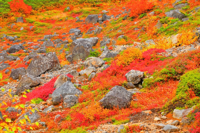 下山途中、130万年前の火山流岩石と見事な秋色の光景に感動して撮る。