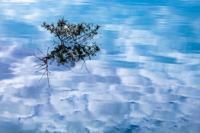 紅葉にはまだ少し早い五色沼。水面に映った雲の模様の美しさを写し止めた。