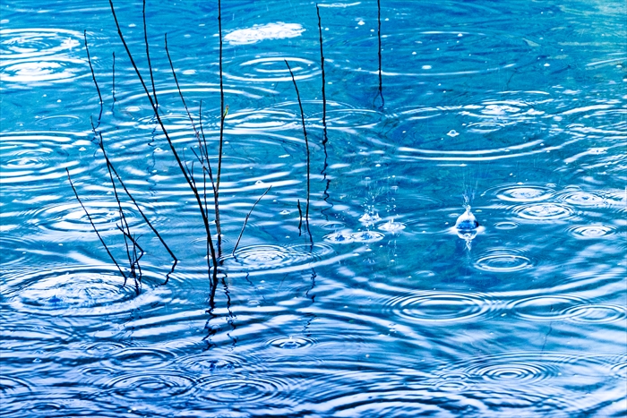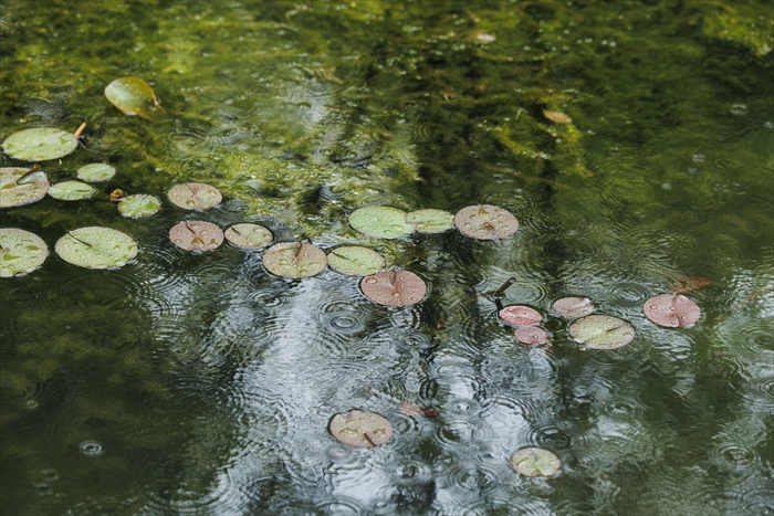あいにくの雨。水面に落ちる水滴の模様が面白くシャッターを切った。