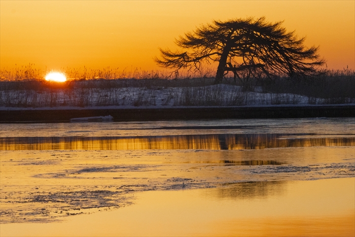 夕日が沈むころ、川の河口でふと見ると、水の流れと深紅の光の織りなす光景に!