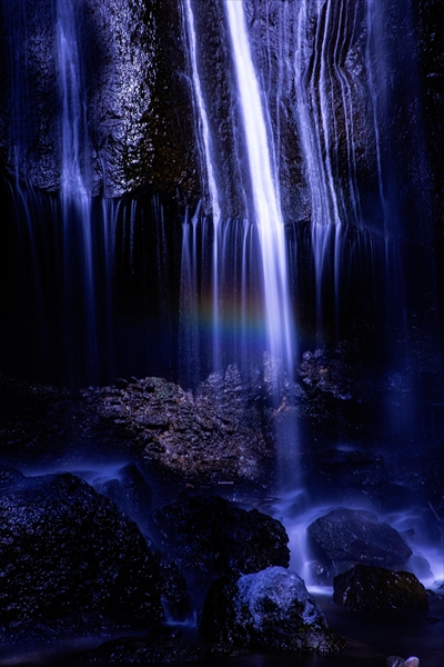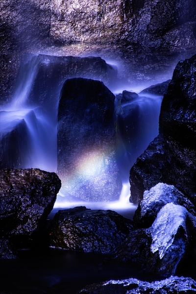カメラを見つめていると、滝の中に光が入り、まるで乙女羽衣が虹色。