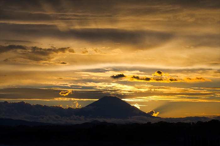 橙色の夕陽と雲の光が織りなす幻想的な富士の夕景です。