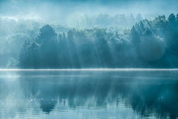 前日の雨が上がり深い霧の中に薄い光芒が一瞬入り湖面に反射しました。